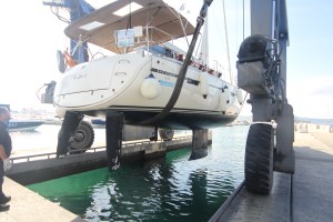 We quickly untied the boat. We moved to the most remote corner of the marina. There, a giant blue traveler was waiting for us. In a few minutes the boat was hauled out for us to inspect the hull. It had been a charter boat. It was the end of the season. The first look was not so encouraging. There were plenty of barnacles on the keel. Many rust strikes were coming from the exhausts and the through hulls. The sides were non-polished.