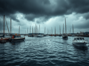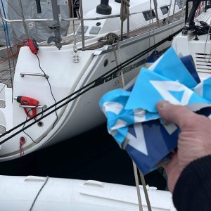 I get some respite from the rain. With effort, I bring the dinghy aft. I manage to remove the large stickers from the charter company. Now there are two left on the bow, but they are out of my reach for the moment. The next job is to cut out the old emergency stair, now a tangle of red line and plastic. I replace it with a new one.