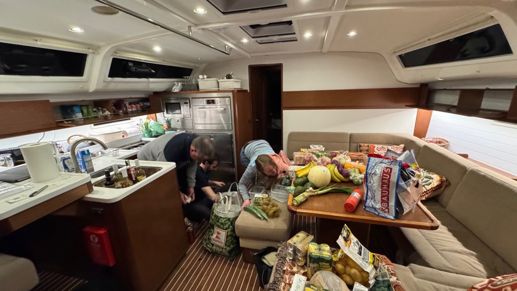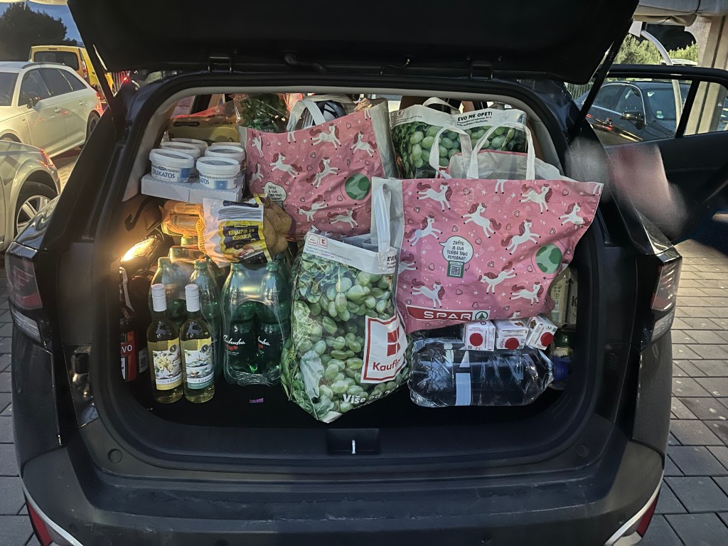 Our crew is now complete for the week. We will move the boat from Trogir to Dubrovnik. Mike, Robin, Alyssa, Selina and Julia are all onboard now, and the first chore is victualing. We rent a car and drive to Kaufland. The result is impressive, the car is packed to the rafters.