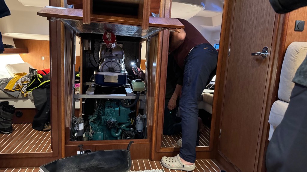 Mike has joined us, the crew begins with familiarizing with the boat: safety briefing, equipments, checks, learning where things are…